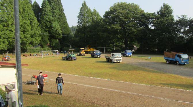 運動場のトラックの部分と直線コースの部分を重機でていねいにならしてくださいました。その後、地面を固める