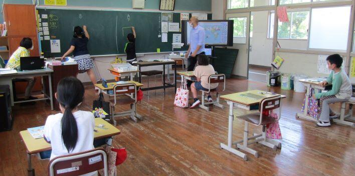 5・6年生の外国語科の授業です。ペアになって、あいさつした後、好きな◯◯は?と質問したり、答えたりしていました。3・4年生の外国語活動は国旗を黒板に描いて、どこの国の国旗かを答える活動をしていました。なかなか面白かったです!来週が楽しみです。