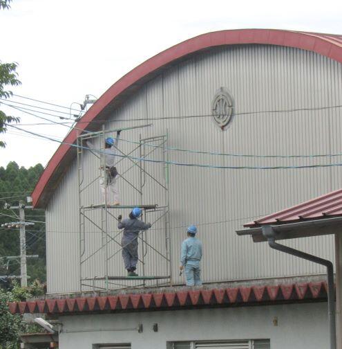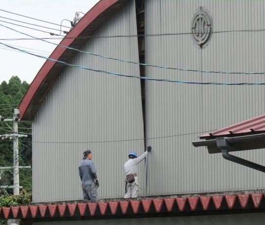 先週の大雨、強風の影響で、体育館の壁の一部がめくれてしまいました。雨がやまないと修理ができません。先週の水曜日、雨もやんだので、業者の方に修理をしてもらいました。午前、午後の3時間ほどで終わりました。ありがとうございました。そのまま修理ができないと、もっと大きくめくれたり、はがれて飛んでしまい、事故に繋がったりする心配がありました。ちょうど雨がやんでくれてほんとうに良かったです。安心しました。他にも、こつこつとしていただいています。ありがとうございます。