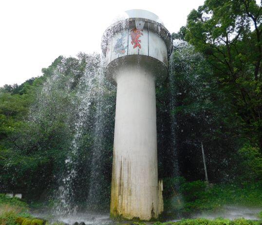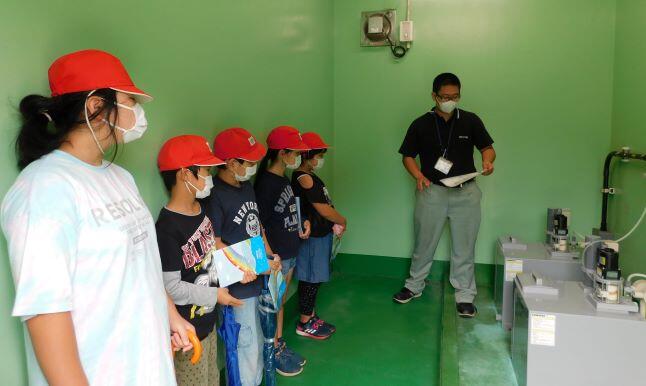 係の方から説明を聞きます。水道の水はどうやって届くのでしょうか?説明を聞いて分かったかな? 右側の塔ののようなものは・・・?水が出てきました(^^;)