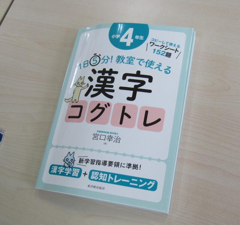 右側がコグトレのテキストです。コグトレとは「Cognitive ○○Training」の略で、○○にはソーシャル(社会面)、機能強化(学習面)、作業(身体面)が入ります。学校では機能強化トレーニング(学習面)を行います。学力の土台となる覚える、数