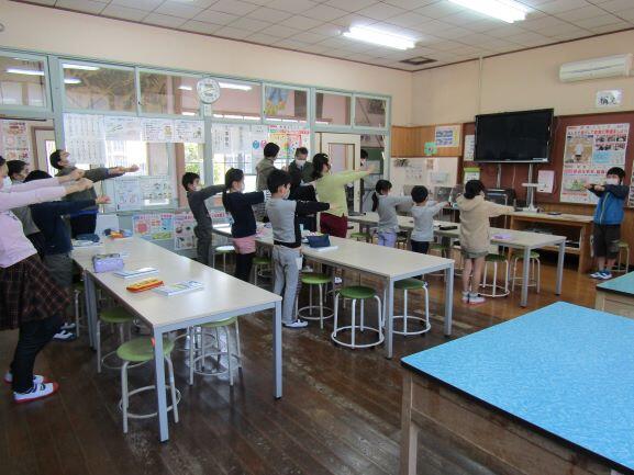 1・2年生は手をたたいています。ちゃんと間違えずにたたけたかな? みんなで20回!グー・パー、グー・パー・・(^_^)