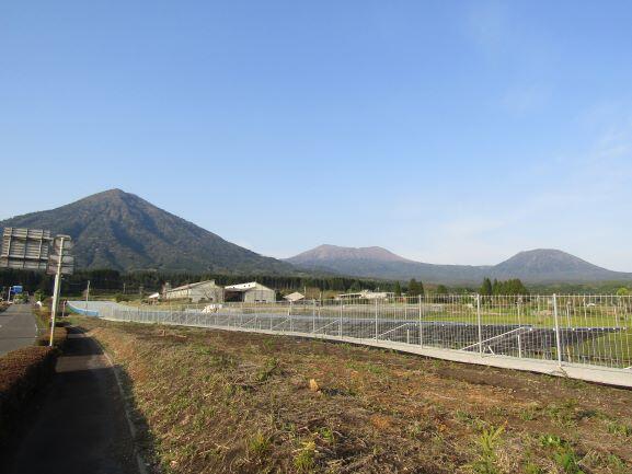 朝の通勤途中に見えた風景です。高千穂峰や夷守岳がとてもきれいです。右の写真、手前の畑にはブドウ棚があります。
