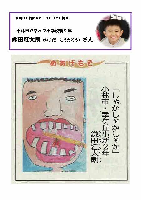 4月18日(土) この日の宮崎日日新聞に幸ヶ丘小学校の子どもの絵が掲載されていました。第2号が4月8日(水)でしたので、10日後に第3号です。素晴らしいことですね。21日(火)から休校になりますが、休校中も絵を描いたり、詩や作文(俳句なんかもいいですね。)を書いたりして、考える力や表現する力につなげていきましょう。では、紹介します。