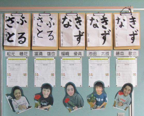 5・6年生の教室です。後には、子どもたちの作品と目標、そして、花を持ってほほ笑む子どもたちの写真が掲示してありました。(^^)/