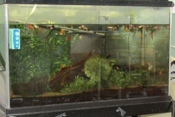 校庭からの校舎、体育館です。校舎も子どもたちがいなくて寂しそうですね。1・2年生教室のグッピーやプラティも子どもたちを待っています!