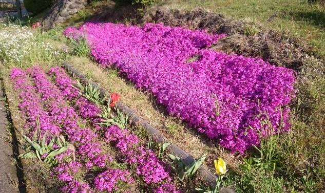 左は4月初めの芝桜です。右はこの日に撮った芝桜です。密集していてとてもきれいにですね。お世話をしてくださった人