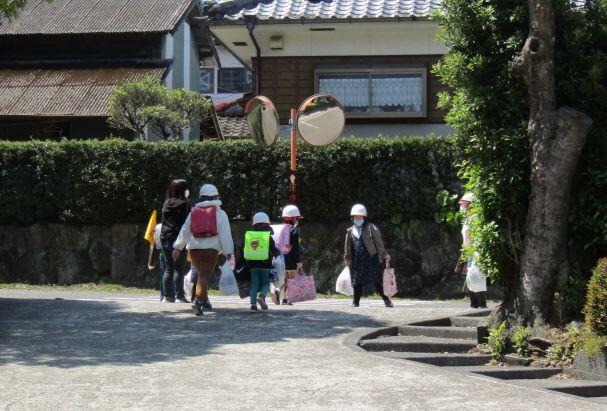 1・2年生は応用編として、校門前の信号機のない道路でも練習しました。 最後にお礼の言葉を言いました。