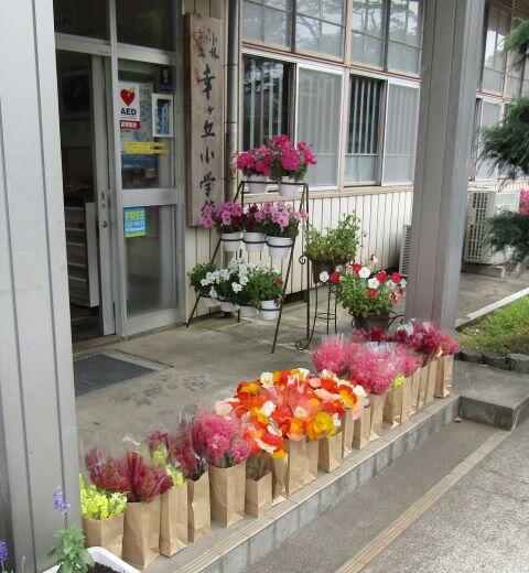 下校する子どもたちの手には花々が・・・。お家で飾ってくださいね。