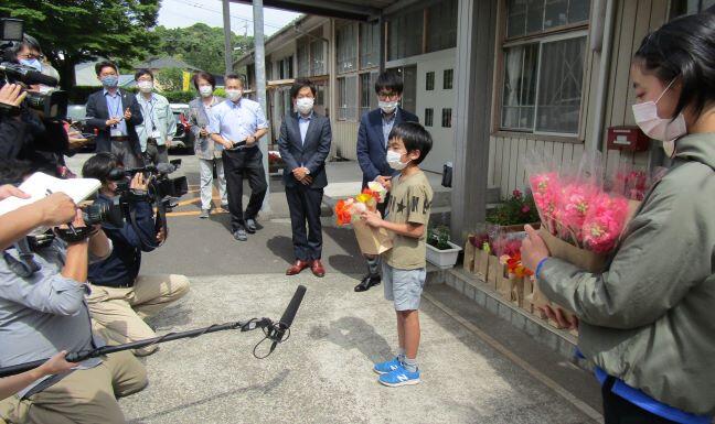 5月22日(金) この日は花の贈呈の取材がありました。生駒高原の休園については先日お知らせしたところですが、生駒高原の花の駅から満開になった花を小林市内の小中学校に無償で提供したいというお知らせがありましたので、本校は地元も地元なので、ありがたくいただくことにしました。本校は全校児童13人ですが、300本!お願いしました。本来は生駒高原まで取りに行くことになっていたのですが、花の贈呈式を幸ヶ丘小学校で行いたいということでしたので、来ていただくことになりました。そうしたら、取材の依頼が殺到!テレビ会社3社、新聞社4社、市の広報も・・・。花の贈呈に関係した方々は市役所の方、花の駅の方など、14名になり、全校児童数を上回りました。(^^;) 花の贈呈、取材の様子をお知らせします。