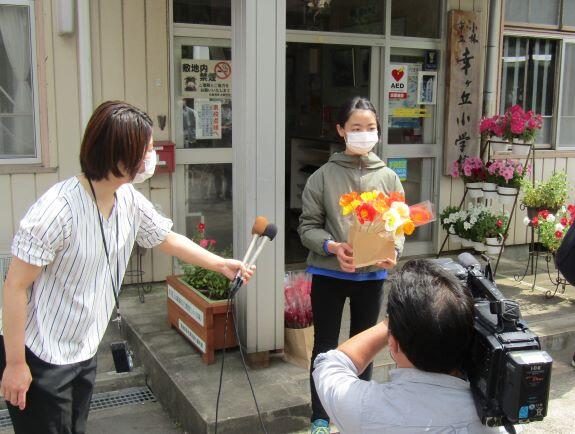 次はテレビのインタビューです。担任の先生がマイクを持っていただきました。こちらも緊張しましたね!(担任の先生も?)