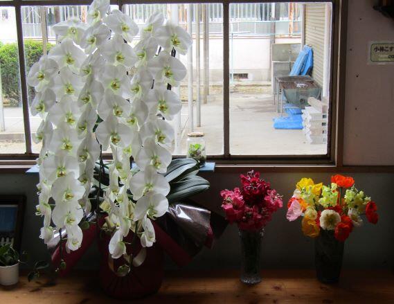 たくさんの取材の方々が・・・。いただいた花です。ポピー、キンギョソウです。一輪ずつ包装されていました。ありがとうございました。ちなみに、市内8校からおよそ1200本の提供依頼があったそうです。本校は4分の1ですね。
