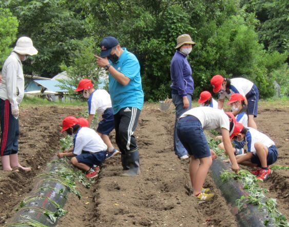 先生が植え方の見本を見せました。2~4年生は経験があるので、手慣れた様子で次々に植えていきます。