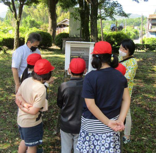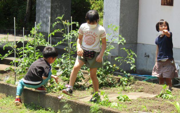 新しい百葉箱と以前の設置場所です。白い色が緑に映えます。 1・2年生です。栽培園で生長の観察です。こちらを指さし