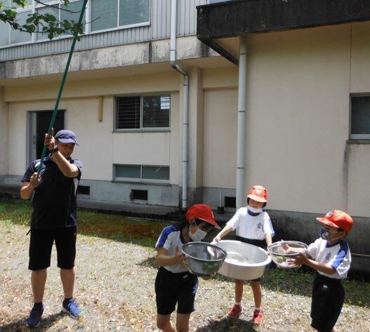 梅雨入りして、3週間になります。雨の日が多くなりましたね。入梅の語源ともなっている「梅」ですが、前にご紹介した本校の梅の「梅ちぎり」を1・2年生が行いました。ちぎりと言っても、実際は竹の棒で梅の実を落とすのです。昨年に比べて、実が少ないそうです。また、家庭科室からはおいしそうなにおいが漂ってきたので、早速、見に行ったところ、5・6年生が調理実習をしていました。3・4年生は理科の実験で使う模型を一生懸命作っていました。子どもたちは梅雨時でも元気です(^^)/