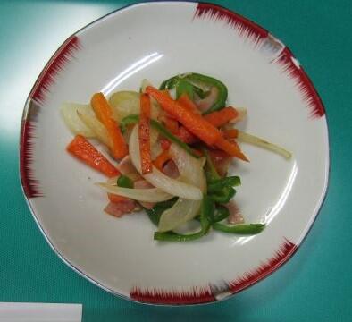 調理実習は、「炒める調理」ということで、野菜(たまねぎ、にんじん、ピーマン)を炒めていました。先生方にも持ってきてくれました。味はとってもおいしかったです。ごちそうさまでした。これで「野菜炒め」がレパートリーに入りましたね(^_^)v