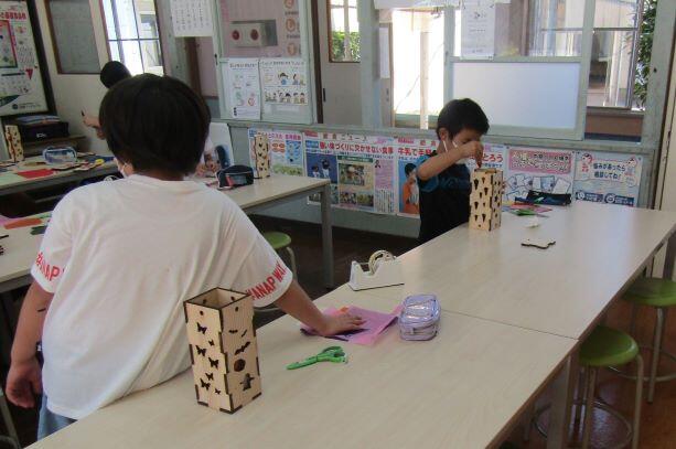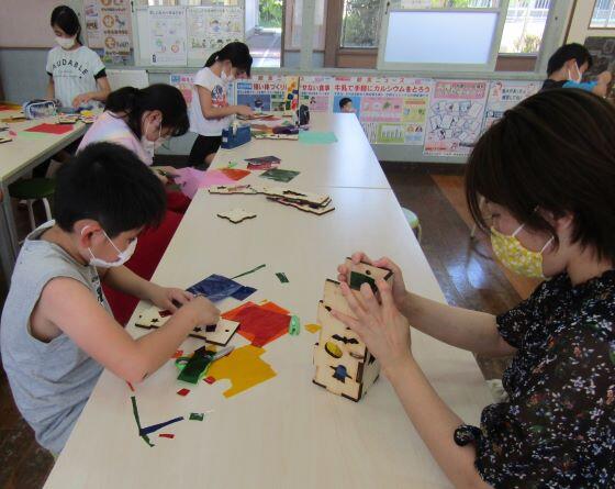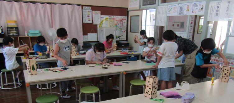 6月23日(火) この日は2回目のクラブがありました。前回はスポーツをを楽しみましたが、今回は木工です。木工と聞くと、板を切ったり、金づちでトントンしたりすることを連想しますが、この日の木工は、ランプづくりでした。あらかじめ作ってある板を組み合わせたり、セロハンを貼ったりして、オリジナルのランプを作りました。明かりをつけたランプはきれいでしたでしょうか?材料をいただいた木工所の方、ありがとうございました。