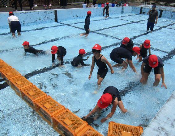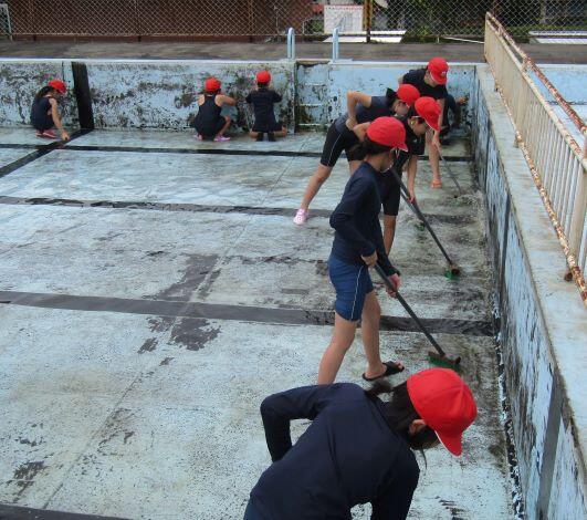 プール清掃です。3・4年生は壁を、5・6年生は床の汚れを落としました。おかげさまできれいな中でつかみ取りができました。さて、つかみ取り大会はどのようになりましたかな?乞うご期待!