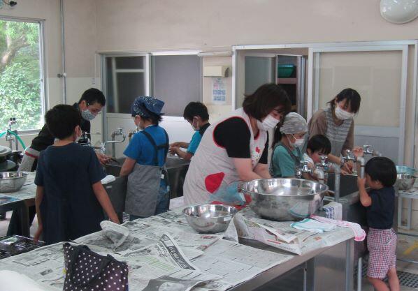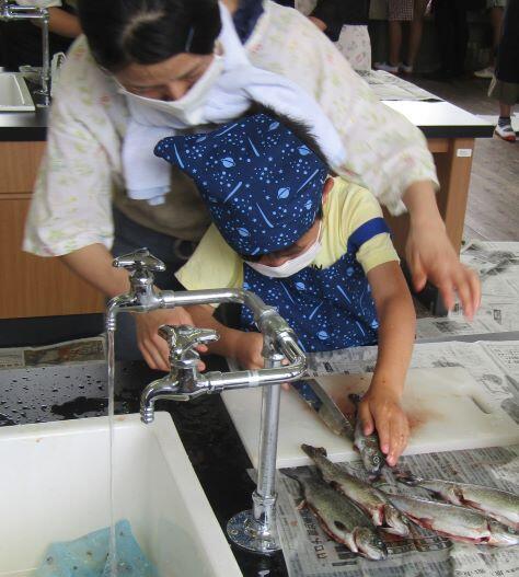 密を避けるように、家庭科室と旧給食室の2カ所に分かれて家族単位で調理(さばき)しました。妹さんや弟さんも興味があるようでかぶりついて見ていました。