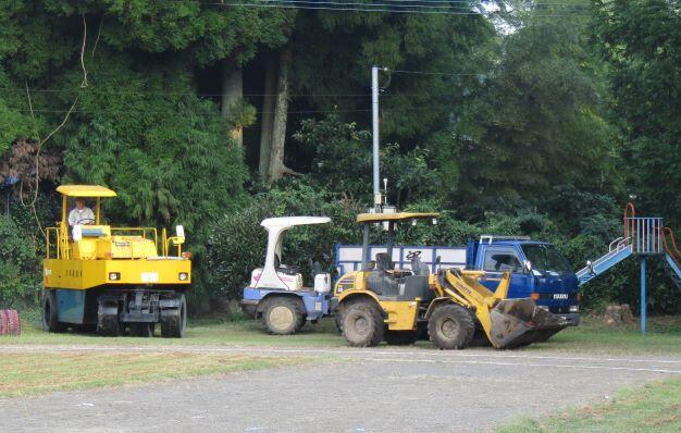 重機やトラックが並んでいます。壮観な風景ですね。学校の奉仕作業とは思えません(^^)