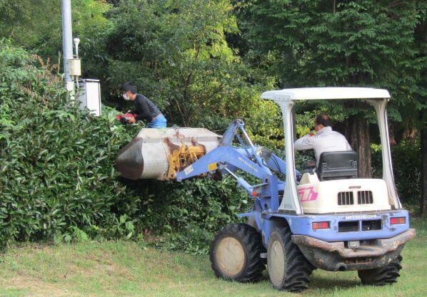 作業開始です。運動場の北側の草刈りです。ショベルの先に乗って高いところの剪定をします。なるほどねぇ~(^^)