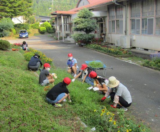 子どもたちと先生方は、イモ畑(子ども農園)や花壇の草取りをしました。