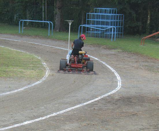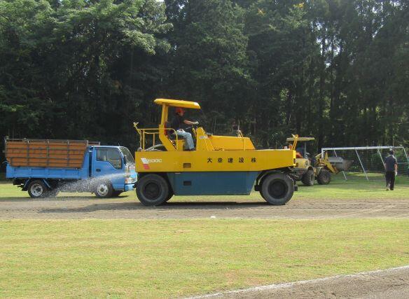 運動場のトラックの部分と直線コースの部分を重機でていねいにならしてくださいました。その後、地面を固める