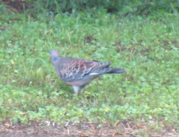 8月26日(水) この日は朝から雨が降ったりやんだりしていました。きれいに整備された運動場も雨にうたれて、草や土の色が鮮やかに見えました。その運動場にキジバト(別名ヤマバト)が1羽、エサを探して歩いていました。