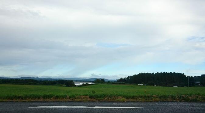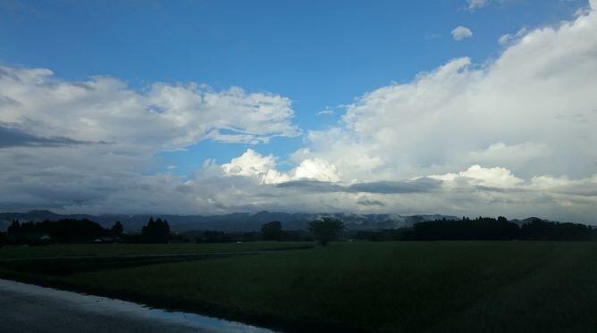 須木、野尻方面です。青空も見えますが、入道雲があります。また、空からカーテンのようなものもおりています。