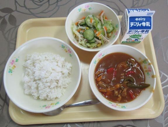 25日の夕方の空です。青空は見えますが、雨雲もあって時々激しい雨も降りました。夷守岳の方は雲がかかっていて、まったく見えませんでした。給食は夏野菜カレーでした。野菜がたくさん入っていて、とてもおいしかったです(^_^)v