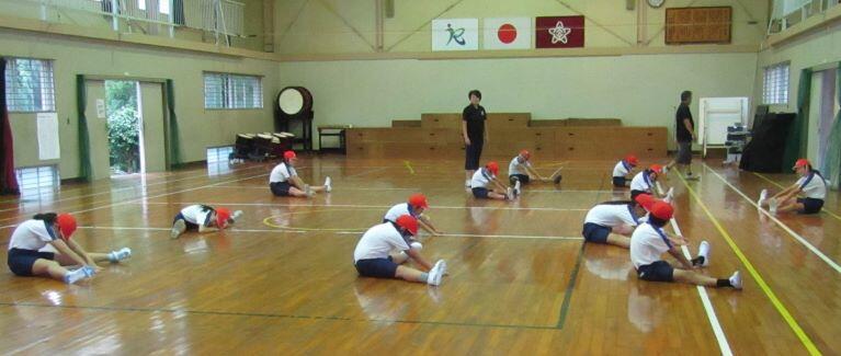 ランニングで身体を暖めます。ボケちゃいました。すみません。準備運動です。うわ~、すごく身体が柔らかい子どもがいますね(^_^) 床に身体がぴったりついています。(^o^)