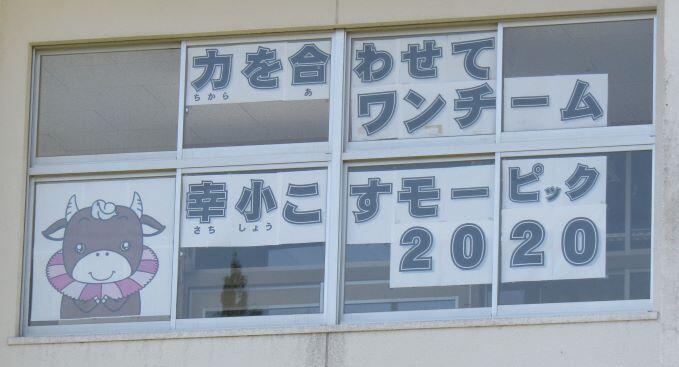 運動場に出ると、令和2年度の運動会のスローガンが北校舎の窓に掲示されていました。