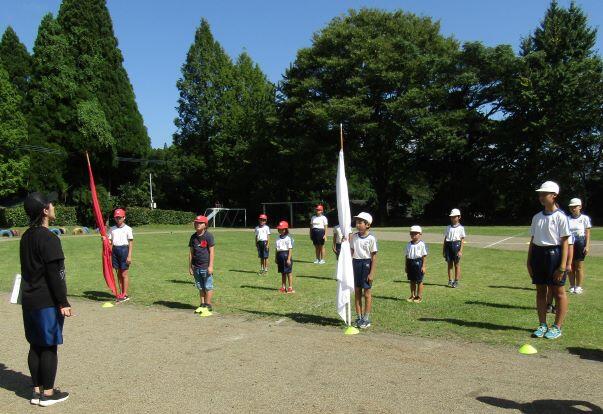 開会式の流れの確認と前に出る子どもの動きなどを練習しました。朝から日差しが強かったです。でも、風が吹いていた