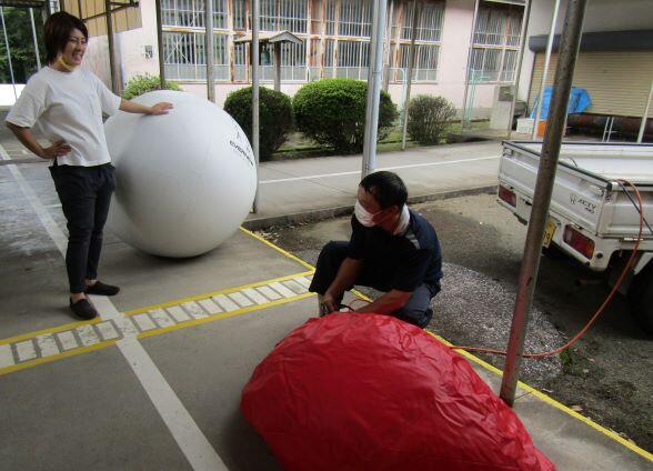 大玉の空気を入れる作業です。右側のコンプレッサーを使って空気を入れます。タンクが2本あるものは