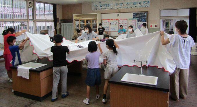 3・4年生は装飾の花をほどいてきれいにします。5・6年生は運動場で使ったイスや長机の足を拭いたり、