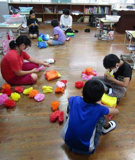 子どもたちも団の装飾です。前の日に作っておいた花をきれいに飾りました。(^^)