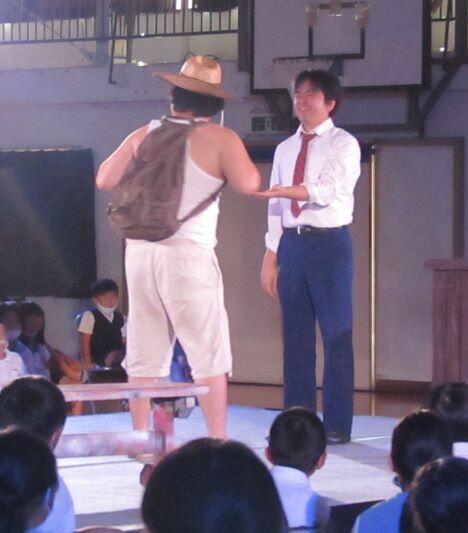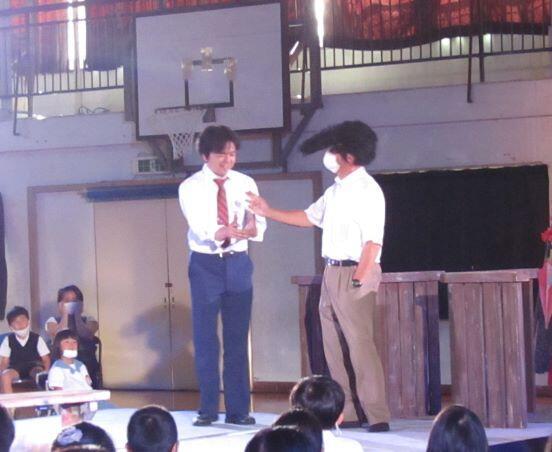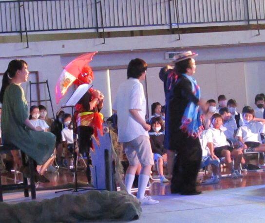 体育館の中央に舞台があり、ステージや通路使い、子どもたちも舞台に上がりました。久しぶりに演劇を見て、表現することの素晴らしさを感じました。子どもたちも大いに楽しめたようです。劇団こふく劇場のみなさん、ありがとうございました。