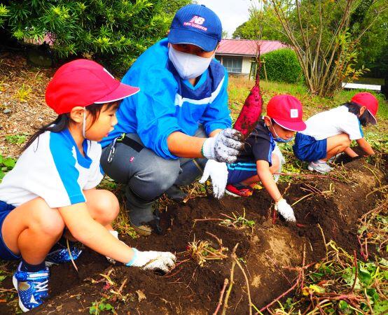 先生から掘るときに注意することについてお話がありました。さあ、イモ掘り開始です!