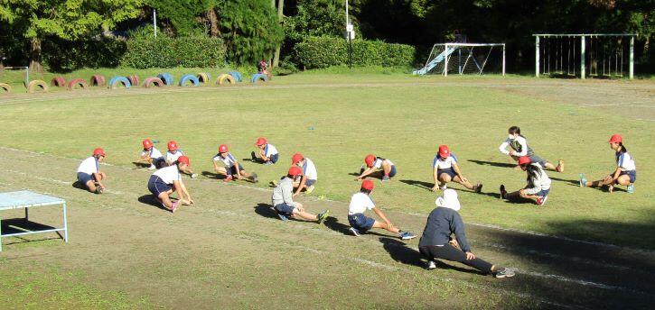 走り終わったら、円になって整理運動です。しっかりやっておかないと、あとでいたくなりますからね。