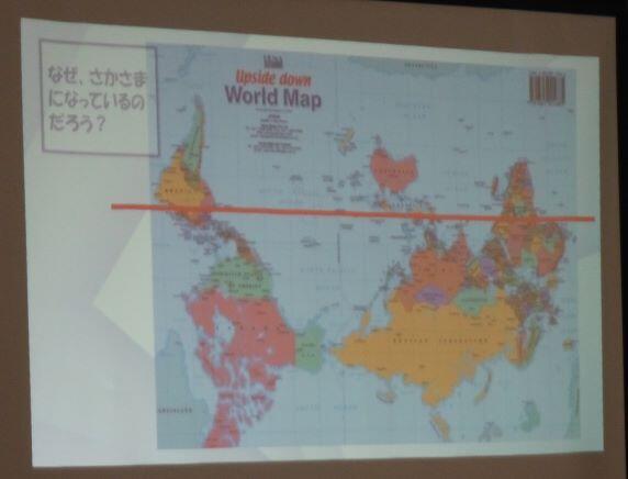 3通りの地図(太平洋が真ん中、ヨーロッパが真ん中、北と南が逆になっている)を示しながらお話しになりました。