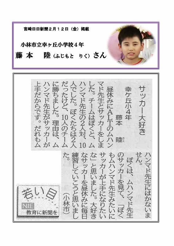 2月12日(金)の宮崎日日新聞「若い目」の作文に、今年度7号となる児童の作文が掲載されました。ご紹介しましょう。