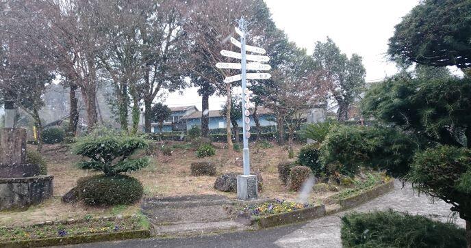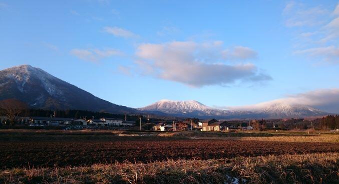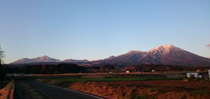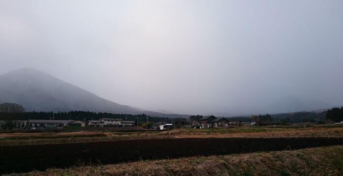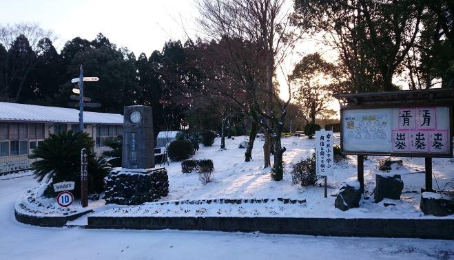 この日の高千穂峰と夷守岳です。山肌や山頂には雪が積もっていました。この時は青空が見えていましたが、学校に近づく