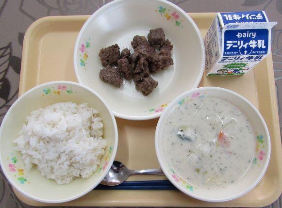 国からの補助による宮崎牛の提供でした。メニューは、麦ご飯、サイコロステーキ、冬野菜のクリーム煮 でした。