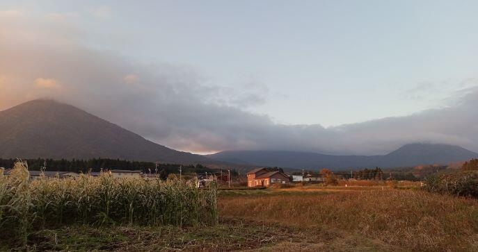 この日の朝の幸ヶ丘三岳です。山頂には雲がかかり、白くなっていました。