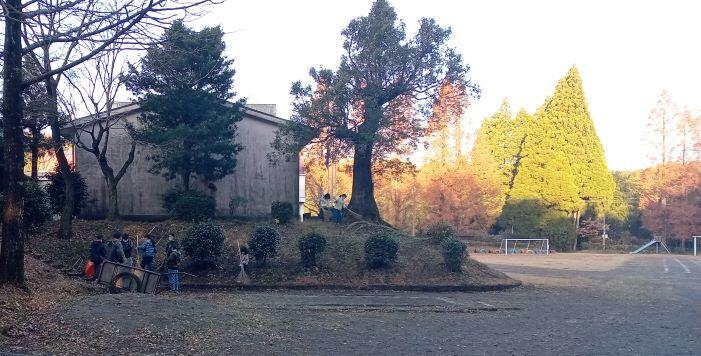 気温は1℃でした。運動場では、子どもたちと教頭先生が落ち葉はきをしていました。