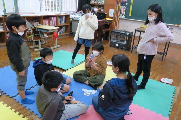 5・6年生の授業です。各月の学習をしていました。頭の上のカードに書かれている「月」について、座っている子どもが