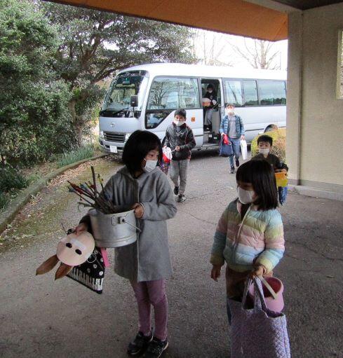 ご紹介します。 玄関前に整列します。天気は快晴です! バスに乗って出発します。“いってきま~す!”
