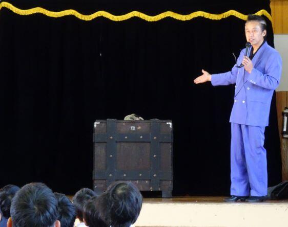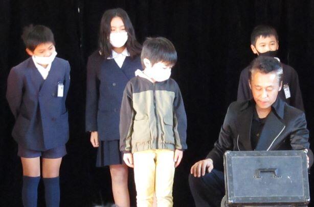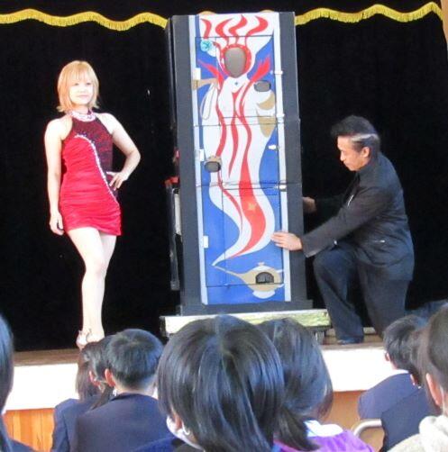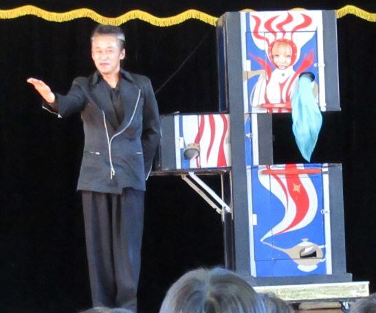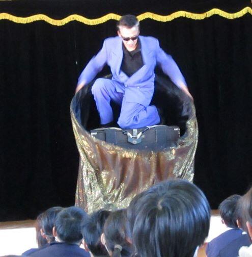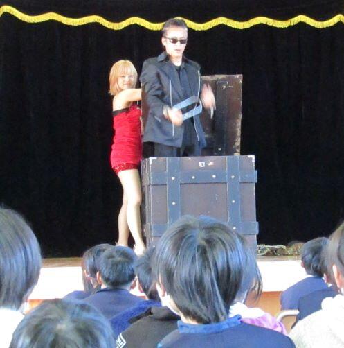 1~3年生はこれより前に鑑賞を終えていました。)マジックショーの始まりです。最初は箱が・・・・。