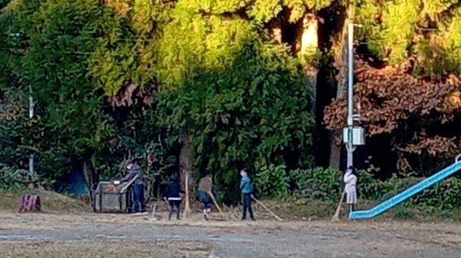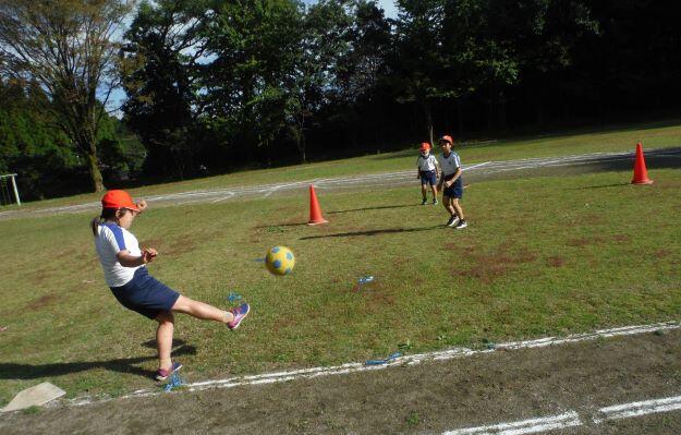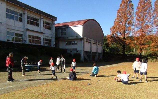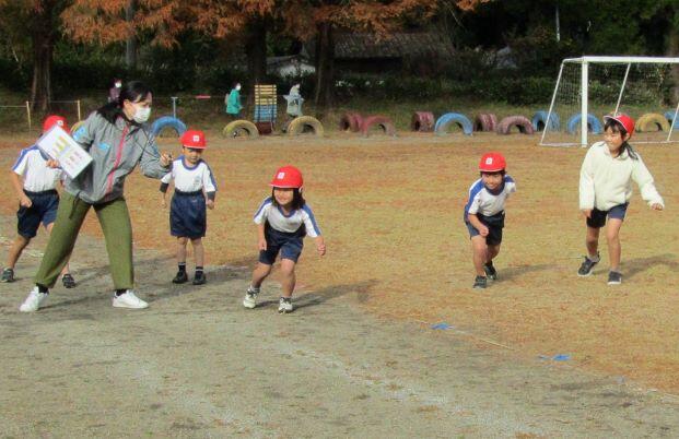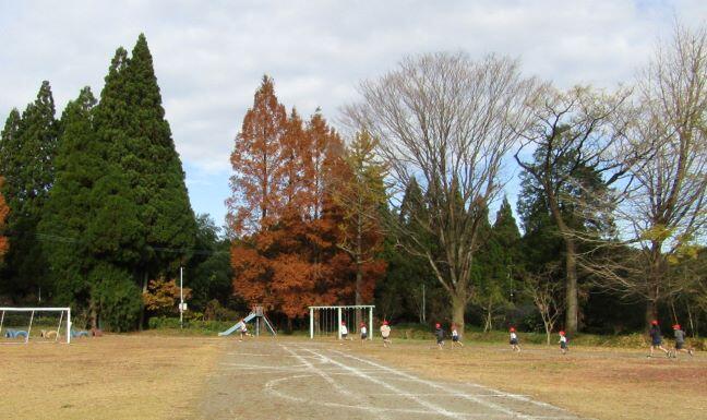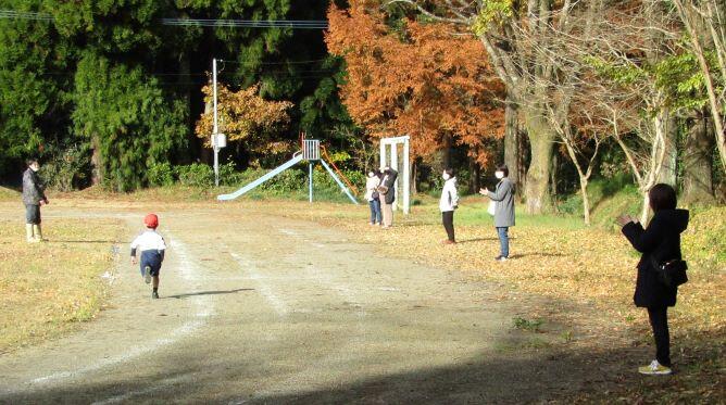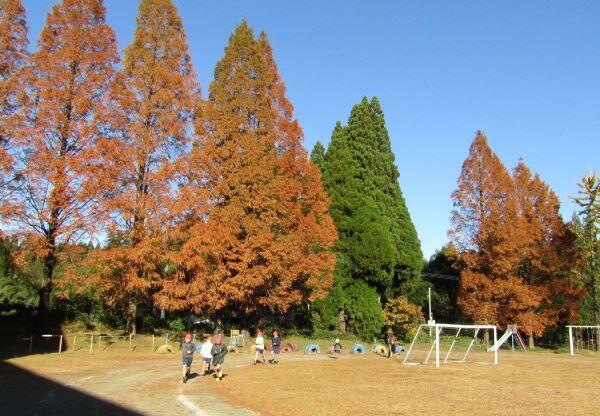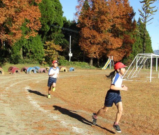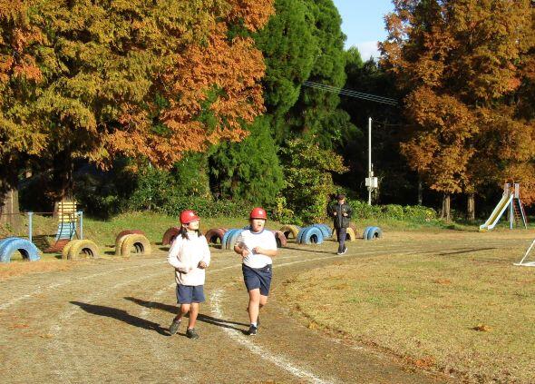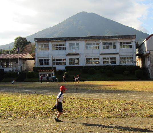山を背景に走る子どもたちです。なんか~いいですね(^_^)v 落ち葉があるのもいい・・・。