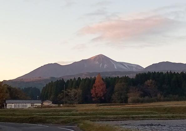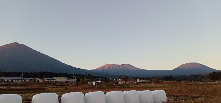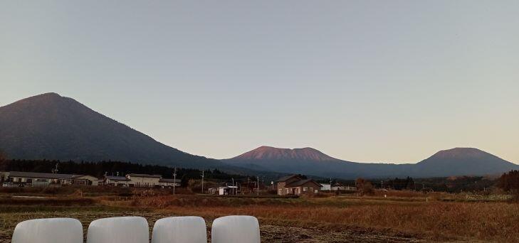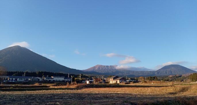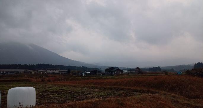 この日の朝の気温は1℃でした。(>_<) 高千穂峰も白くなっていました。手前の畑の土も凍っていて、白く見えました。